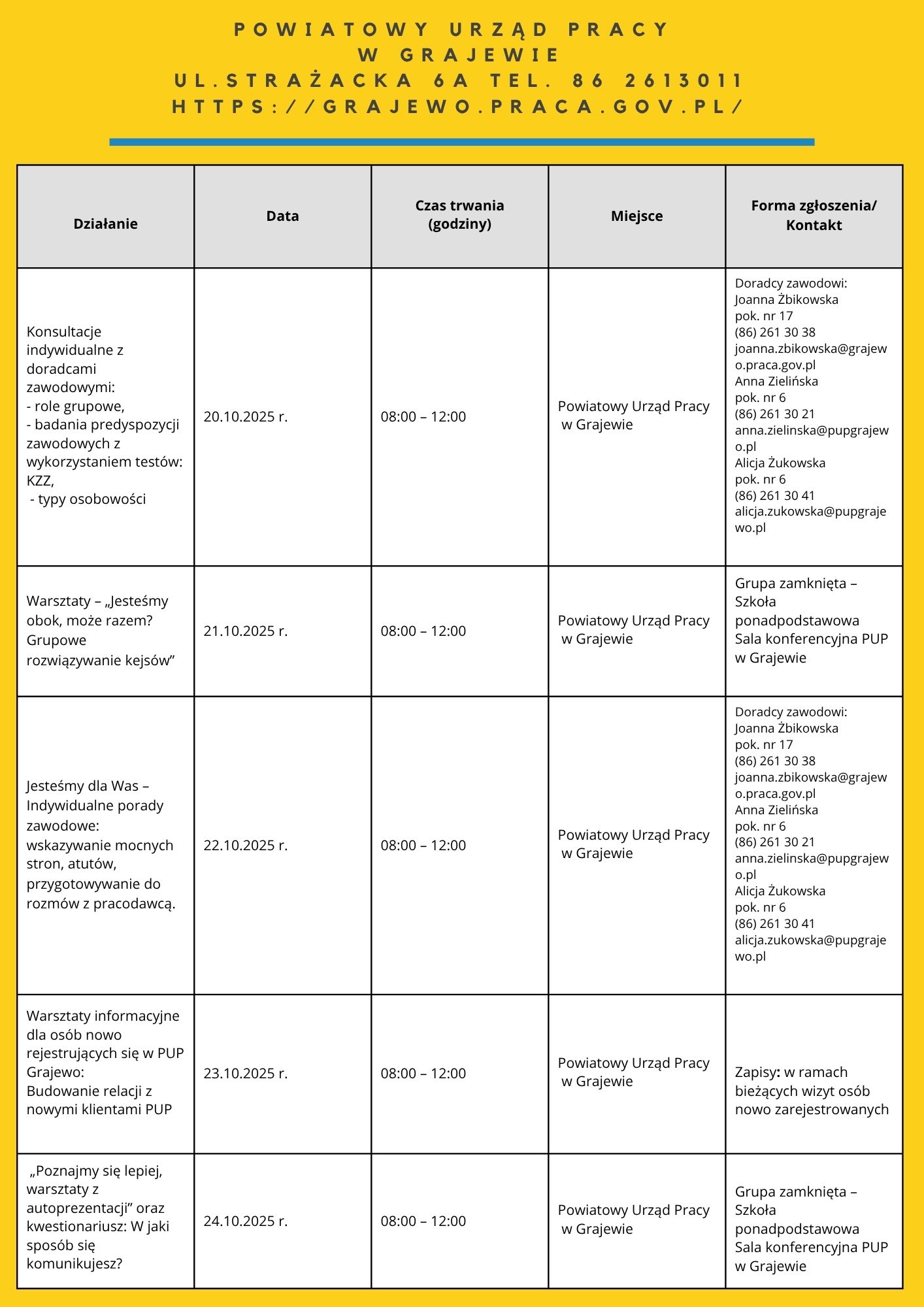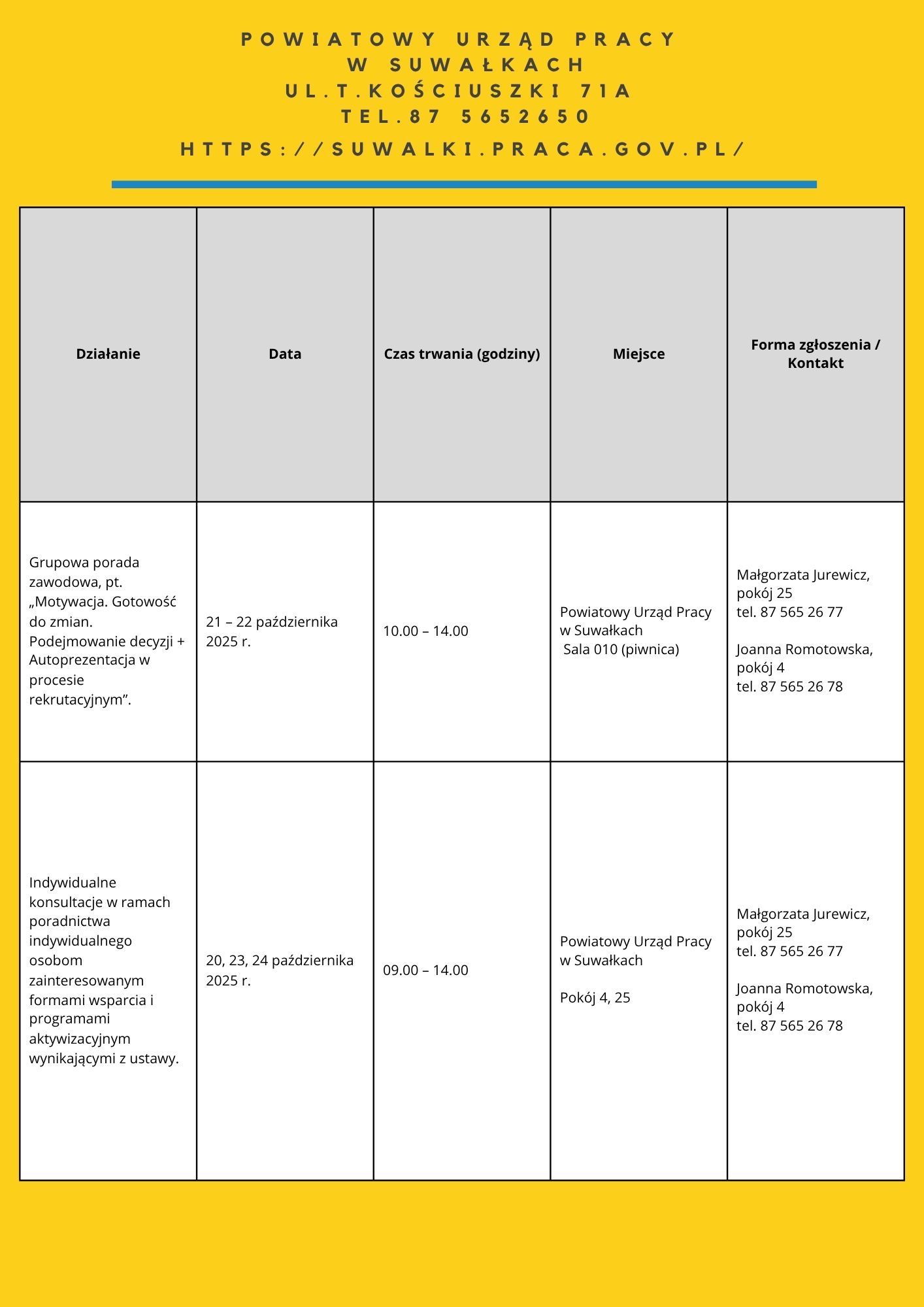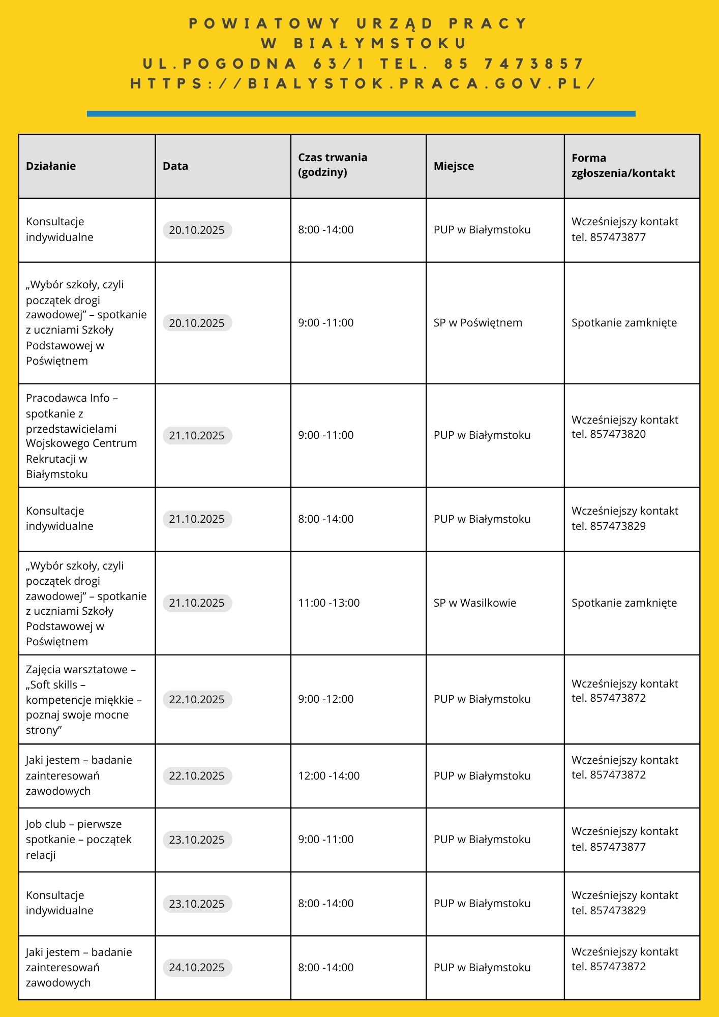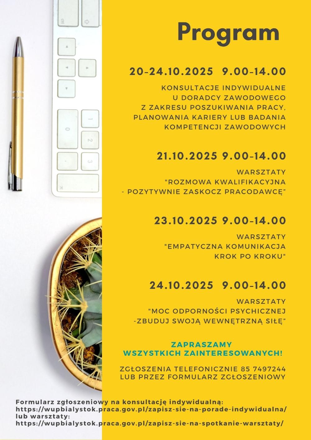 Zapraszamy do zapoznania się z harmonogramem działań OTK 2025. Na niektóre z naszych propozycji obowiązują zapisy. Chętnych do skorzystania zapraszamy do kontaktu: te. 85 74 97 244 lub 241, https://wupbialystok.praca.gov.pl/zapisz-sie-na-spotkanie-warsztaty/