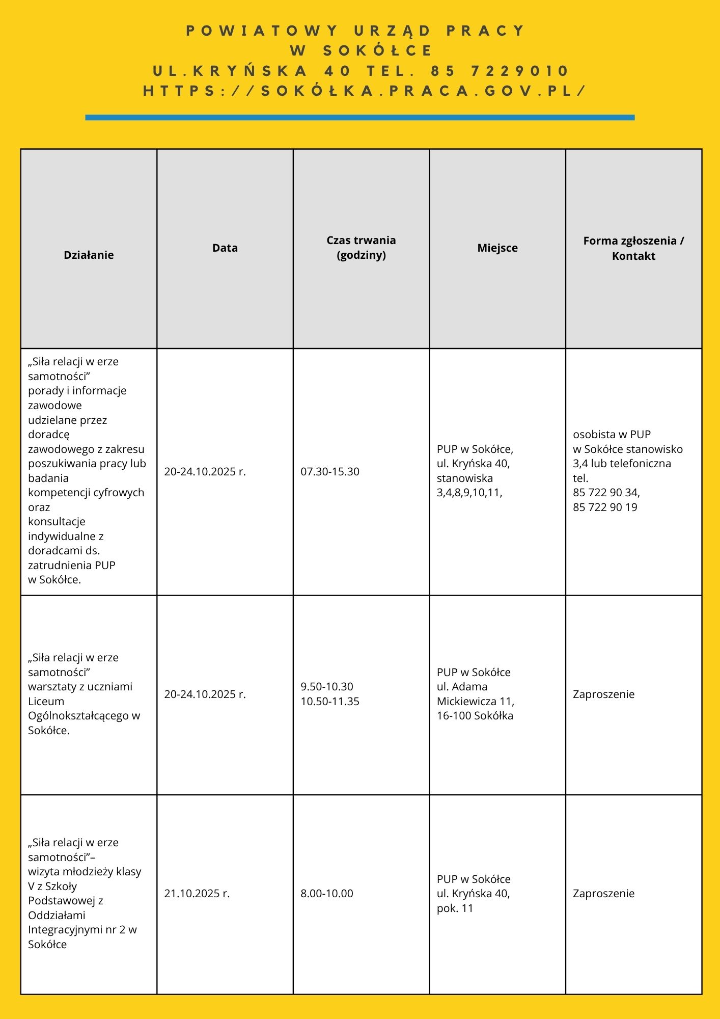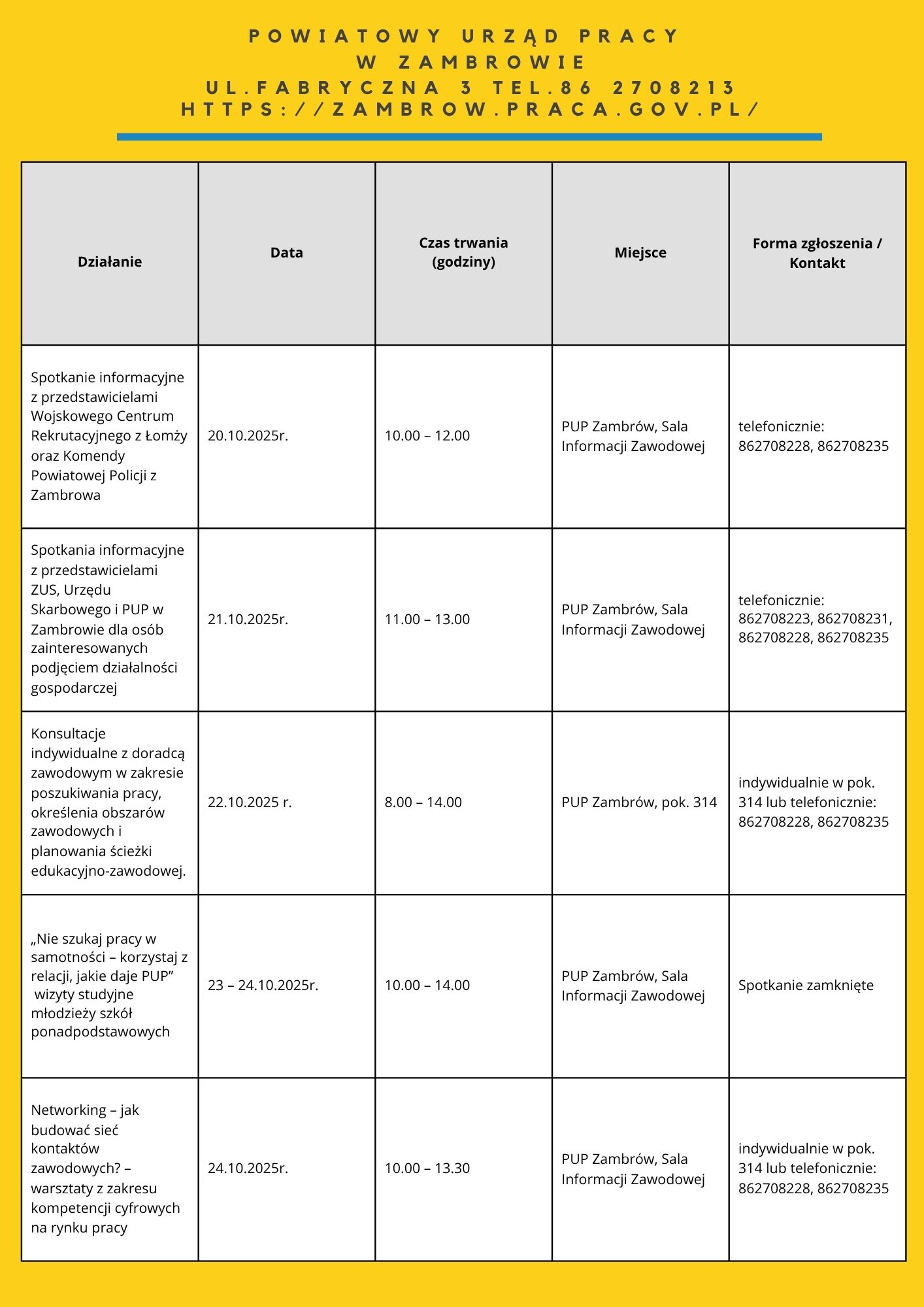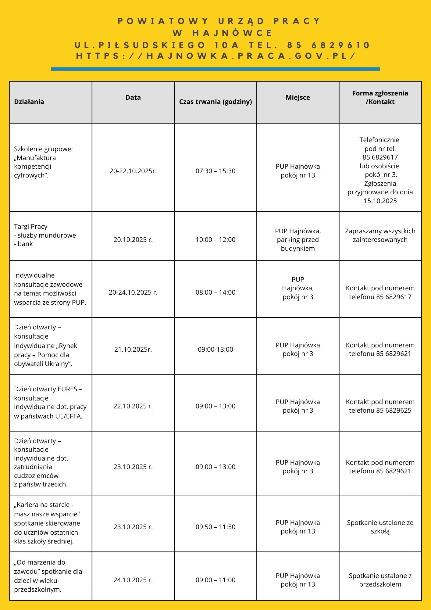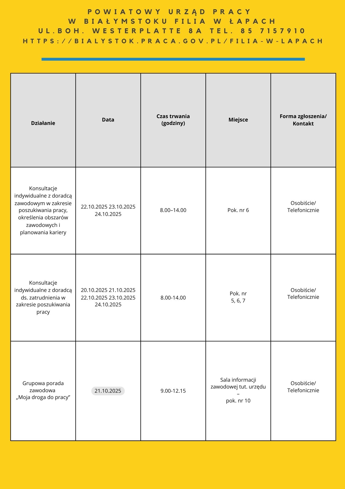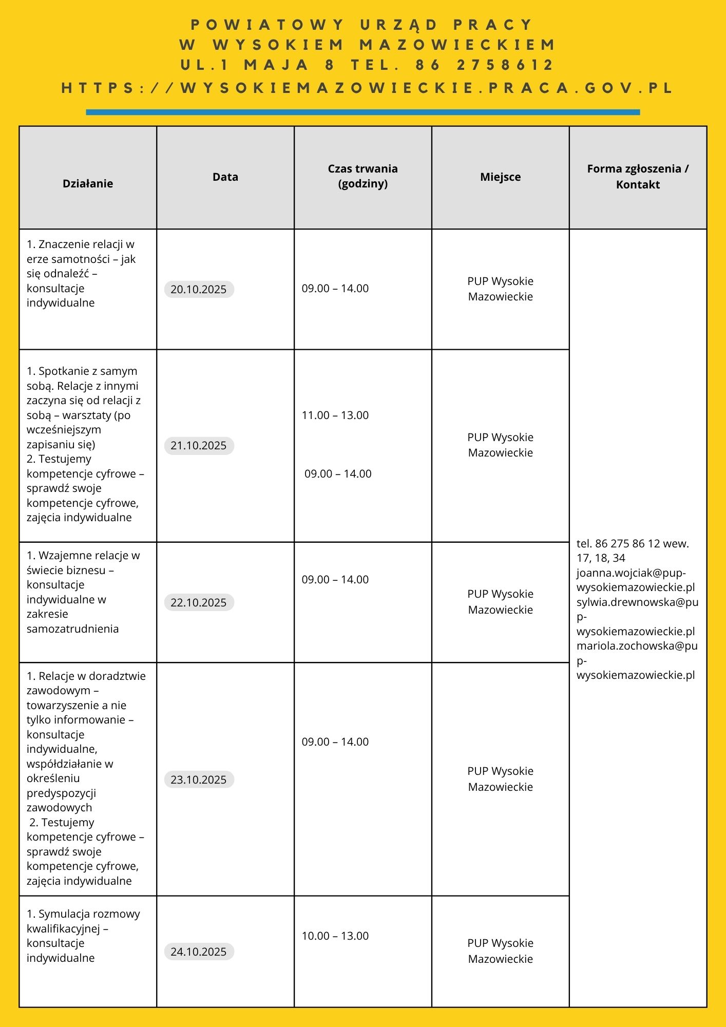 Zapraszamy do zapoznania się z harmonogramem działań OTK 2025. Na niektóre z naszych propozycji obowiązują zapisy. Chętnych do skorzystania zapraszamy do kontaktu: te. 85 74 97 244 lub 241, https://wupbialystok.praca.gov.pl/zapisz-sie-na-spotkanie-warsztaty/