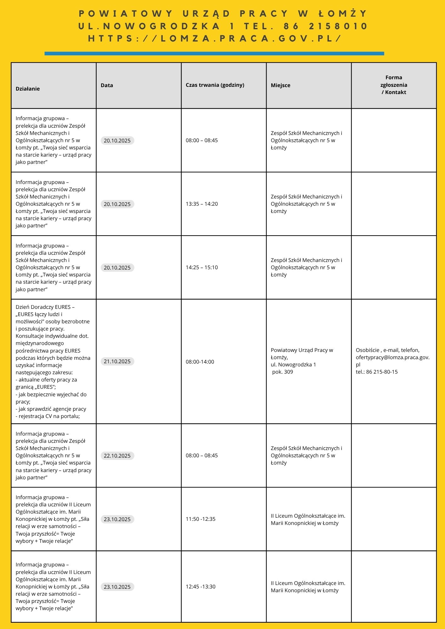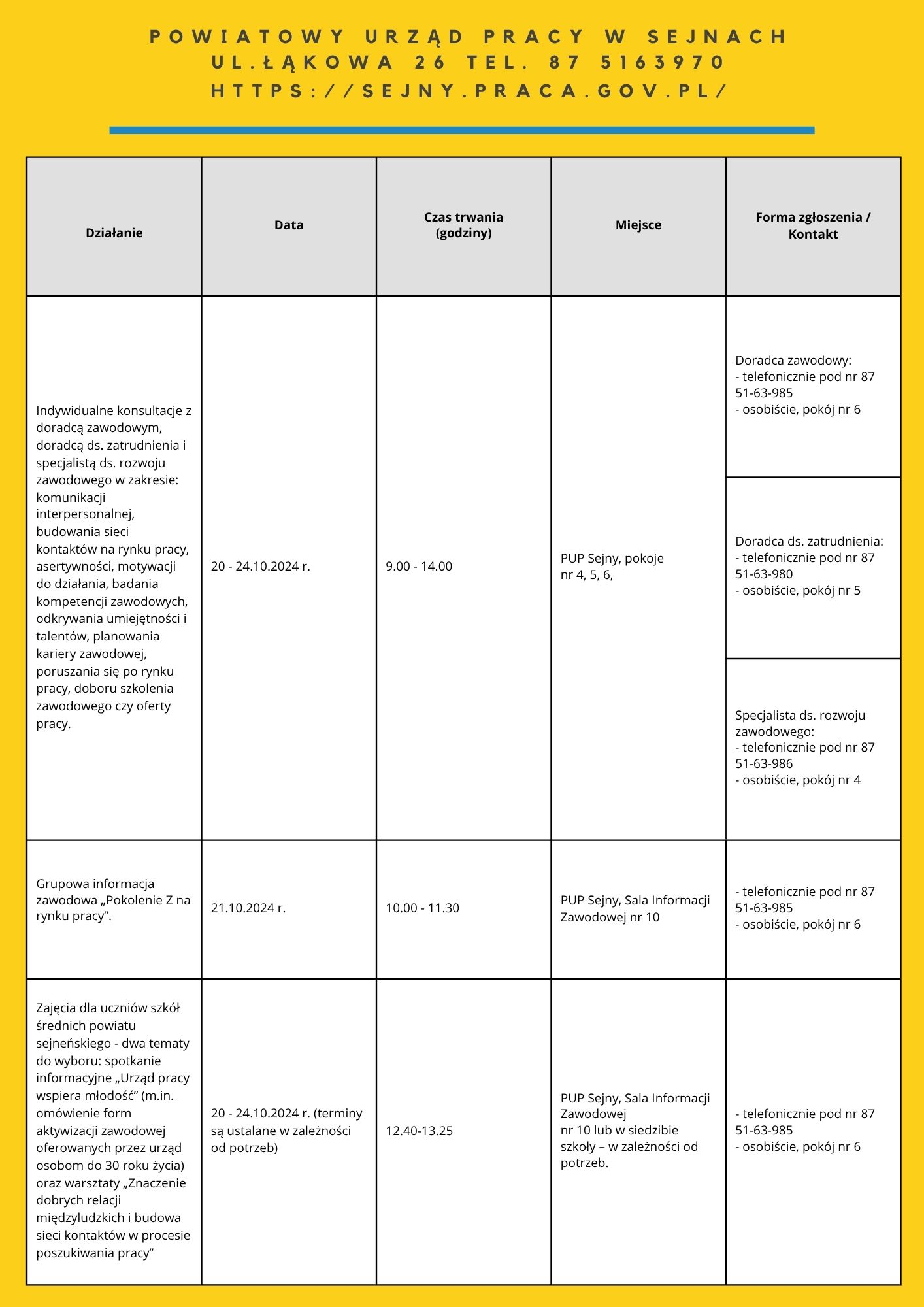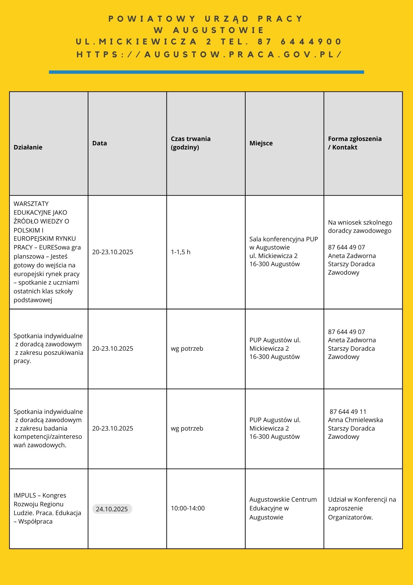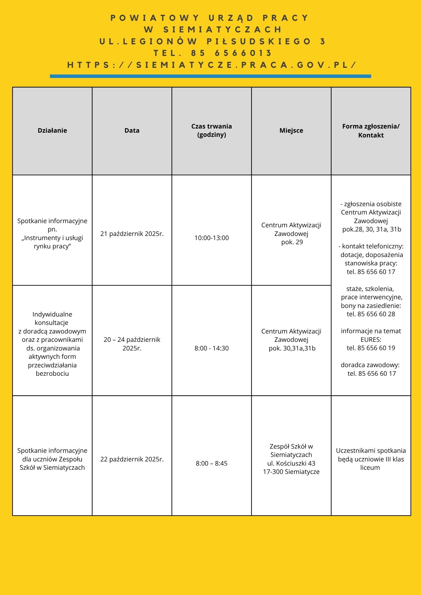 Zapraszamy do zapoznania się z harmonogramem działań OTK 2025. Na niektóre z naszych propozycji obowiązują zapisy. Chętnych do skorzystania zapraszamy do kontaktu: te. 85 74 97 244 lub 241, https://wupbialystok.praca.gov.pl/zapisz-sie-na-spotkanie-warsztaty/