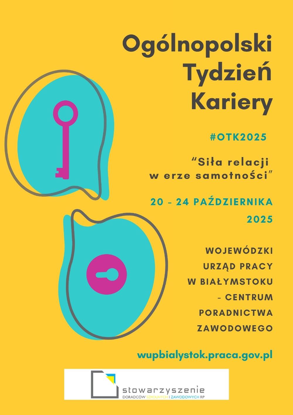 Ogólnopolski Tydzień Kariery (OTK) odbędzie się w dniach 20-24 października 2025 r. pod hasłem „Siła relacji w erze samotności". Wojewódzki Urząd Pracy w Białymstoku oraz Powiatowe Urzędy Pracy w Podlaskiem włączają się w tę inicjatywę, promując doradztwo zawodowe i planowanie karier. Wydarzenia będą organizowane własnoręcznie oraz we współpracy z lokalnymi szkołami, instytucjami rynku pracy i podmiotami ekonomii społecznej.